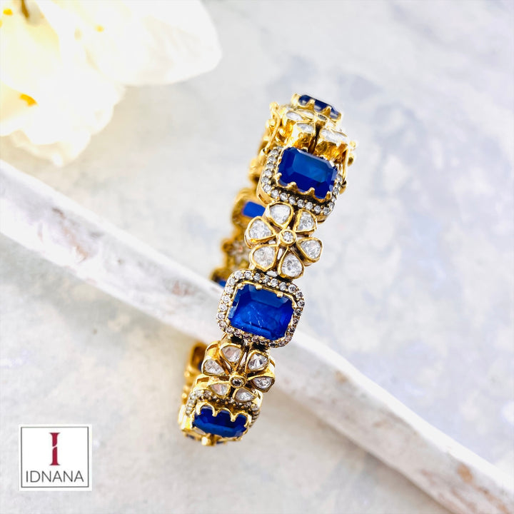 GOLD PLATED BLUE DOUBLET MOISSANITE FLORAL BANGLE (2.4 OPENABLE)