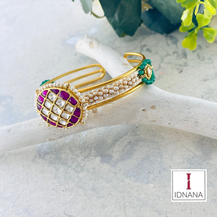 GOLD PLATED PINK WHITE KUNDAN PEARL LINED HANDCUFF