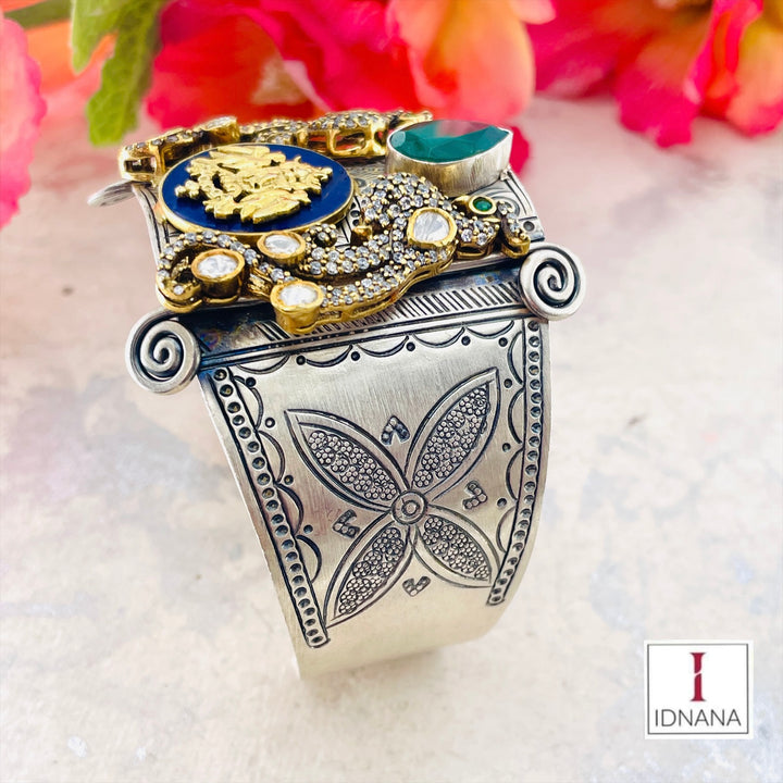 DUAL TONE BLUE ENAMELLED EMERALD DOUBLET MOISSANITE CZ PEACOCK MOTIF STATEMENT HANDCUFF