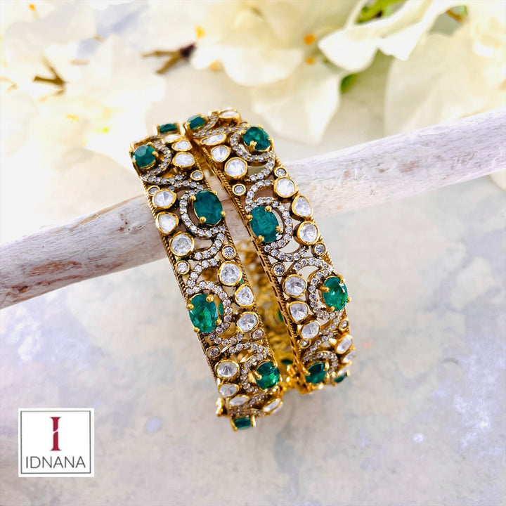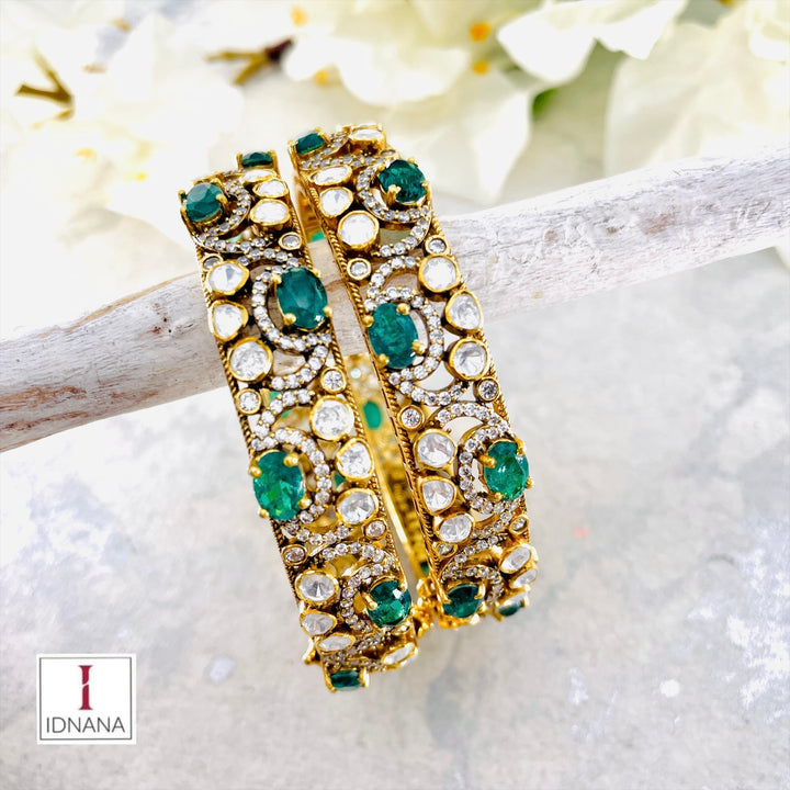 A PAIR OF GOLD PLATED EMERALD MOISSANITE CZ BANGLES SIZE 2.4 OPENABLE