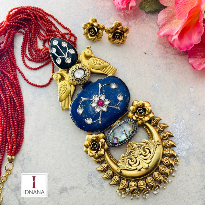 CORAL BEADED GOLD PLATED LAPIS LAZULI AND BLACK ONYX INLAY KUNDAN ABALONE SHELL PARROT AND ROSE MOTIF LONG NECKLACE SET