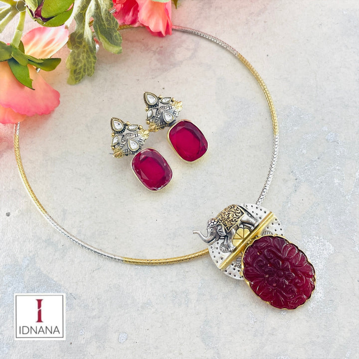 DUAL TONE CARVED RED ONYX ELEPHANT MOTIF HASLI SET