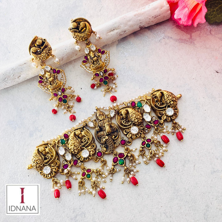 GOLD PLATED GREEN PINK WHITE KUNDAN MOISSANITE MAA LAKSHMI NAKASH PEACOCK CORAL PEARL DROP CHOKER SET