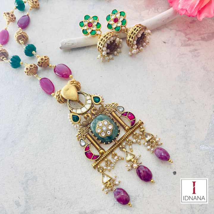 GOLD PLATED CHALCEDONY INLAY KUNDAN RUBY GREEN ONYX BEADED LONG NECKLACE SET